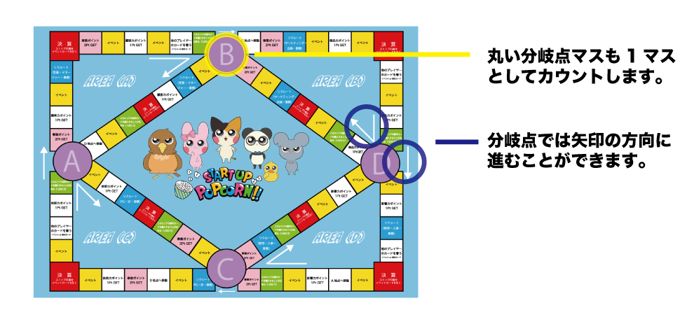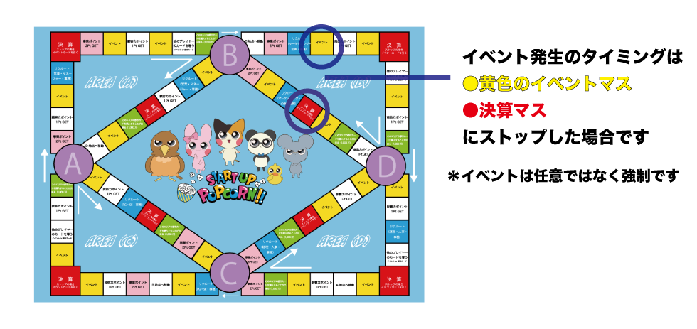 事業成長コースは4つのエリアで構成されており、そのエリアによって購入できる都市カードの種類が異なります。2つのエリアの都市カードを持っていることが上場の条件となります。上場には都市カード2枚と3,000万円が必要になります。