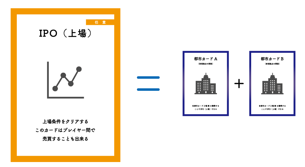 IPO(上場)するためには2種類の都市カードと3,000万円が必要となります。注意すべきは2枚ではなく、2種類ということです!