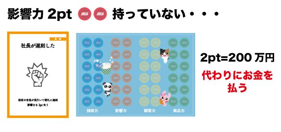 ポイントを失うと記載のあるイベントカードを引いてしまったけど、ポイントを持っていない場合は1pt=100万円として、代わりにお金を払うことになります。